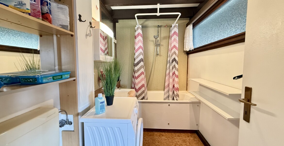 Das Badezimmer ist funktional ausgestattet und verfügt über eine Badewanne sowie eine Waschmaschine, Waschbecken und WC.